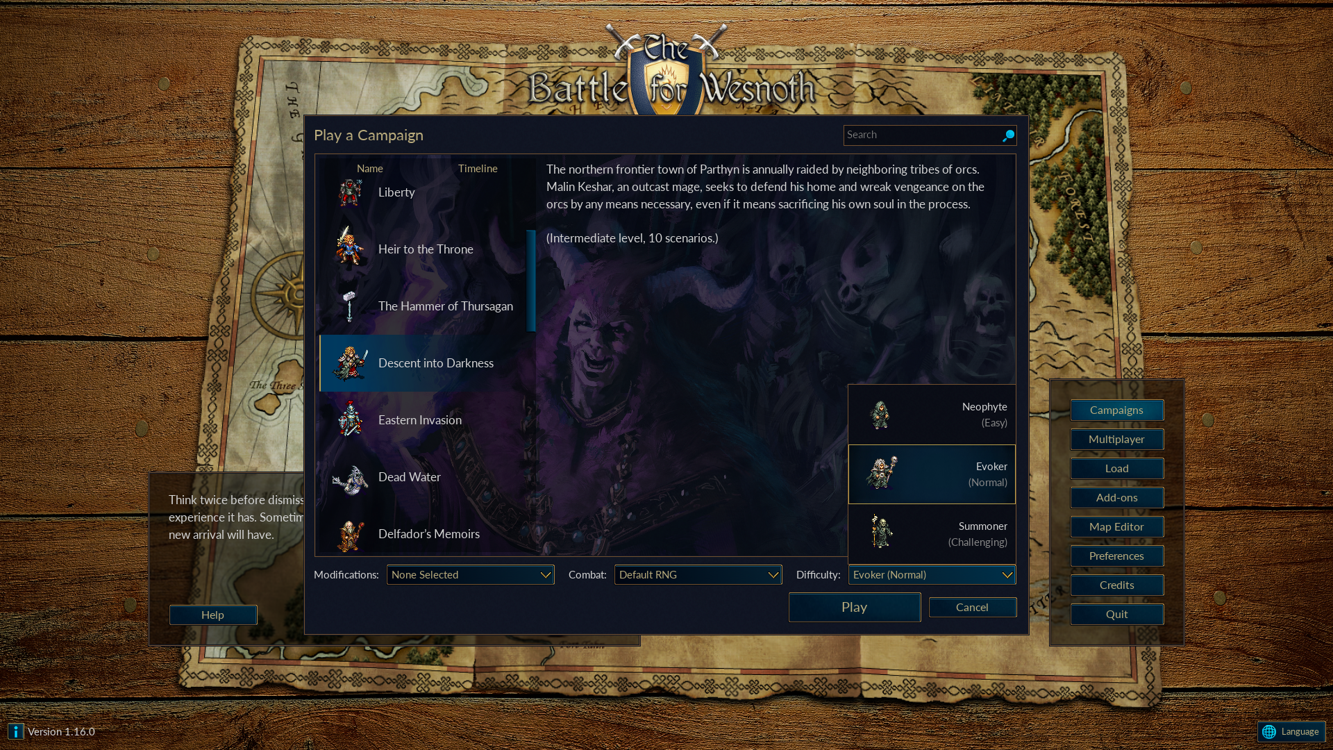 Debido a que hacemos uso de plataformas de distribución más modernas como Steam, itch.io, Flathub y otras, los jugadores se actualizarán automáticamente a una nueva serie estable por primera vez desde que se lanzó Wesnoth. Para permitir esto, se mostrará una opción la primera vez que se inicie 1.16.0 después de actualizarse desde 1.14.17. Esto proporcionará la opción de migrar la configuración, así como de eliminar de la versión 1.16 cualquier complemento que esté instalado, si se ha actualizado para funcionar con 1.16. Para ayudar en ello, Wesnoth ahora permite seleccionar desde el propio juego guardar archivos de versiones anteriores.
